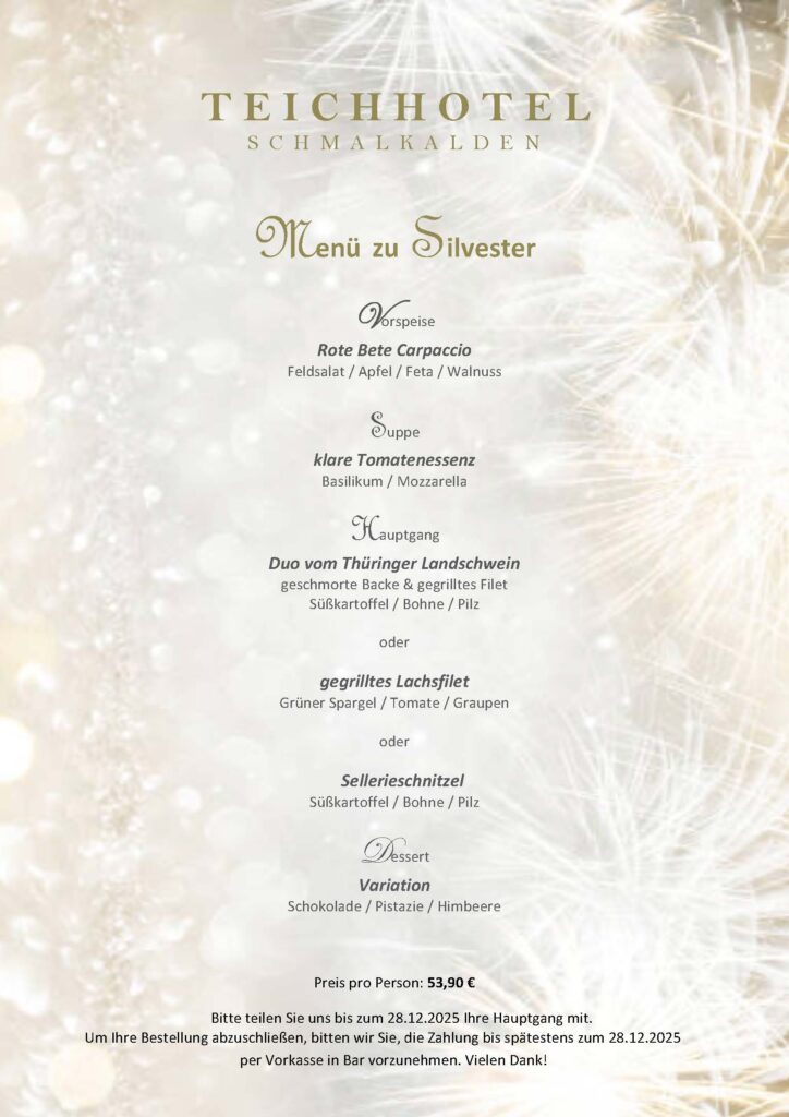 Starten Sie stilvoll in den Jahreswechsel und genießen Sie unser exklusives Silvestermenü 2025 im Teichhotel Schmalkalden. Freuen Sie sich auf ein festliches 4-Gang-Menü voller regionaler Aromen und kreativer Akzente: