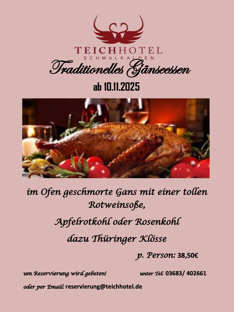es ist wieder soweit. Ab dem 10. November 2025 können Sie wieder unser traditionelles Gänseessen für 38,50 Euro pro Person buchen. Die im Ofen geschmorte Gans wird mit einer tollen Rotweinsoße, Apfelrotkohl oder Rosenkohl und dazu dazu Thüringer Klössen serviert.